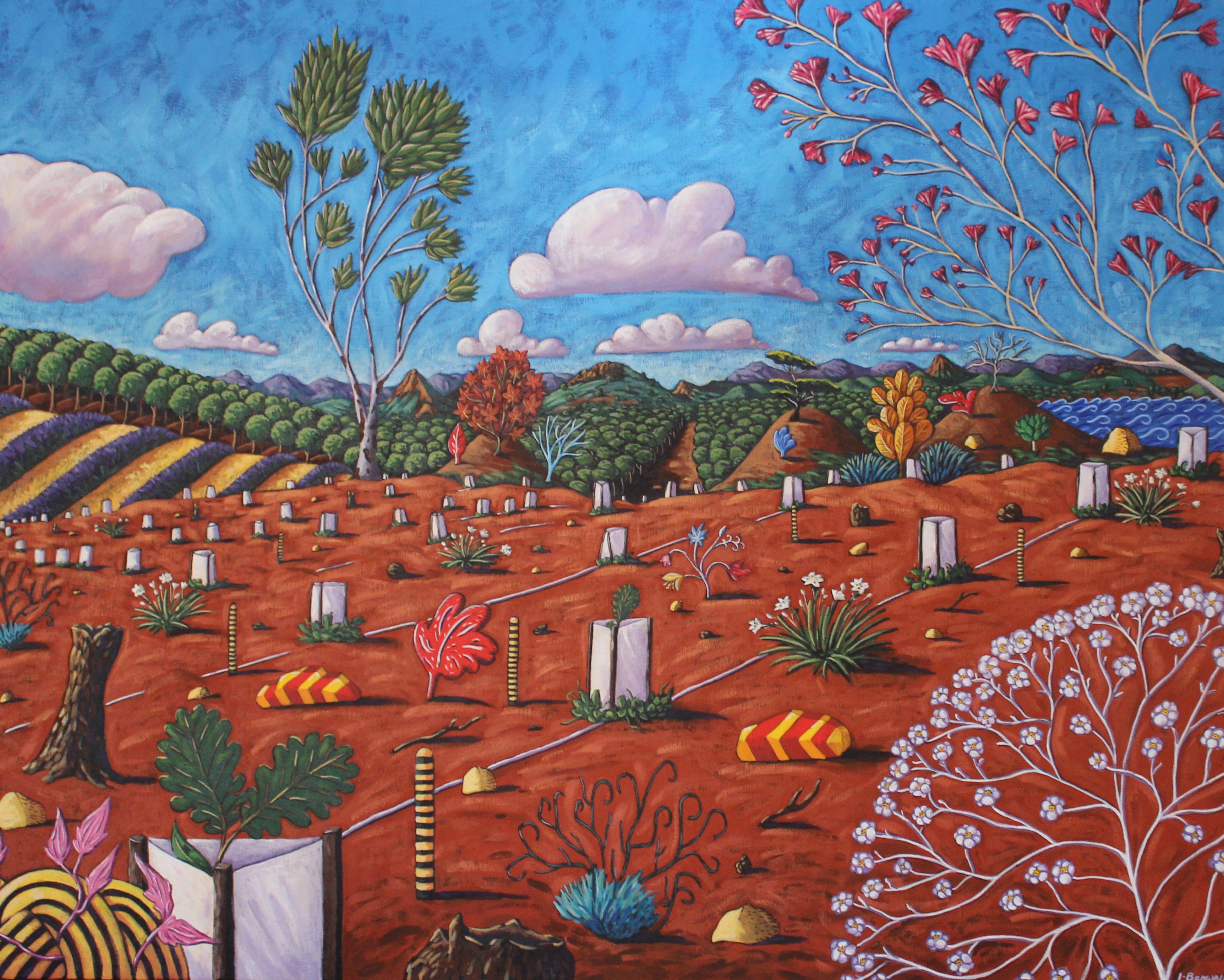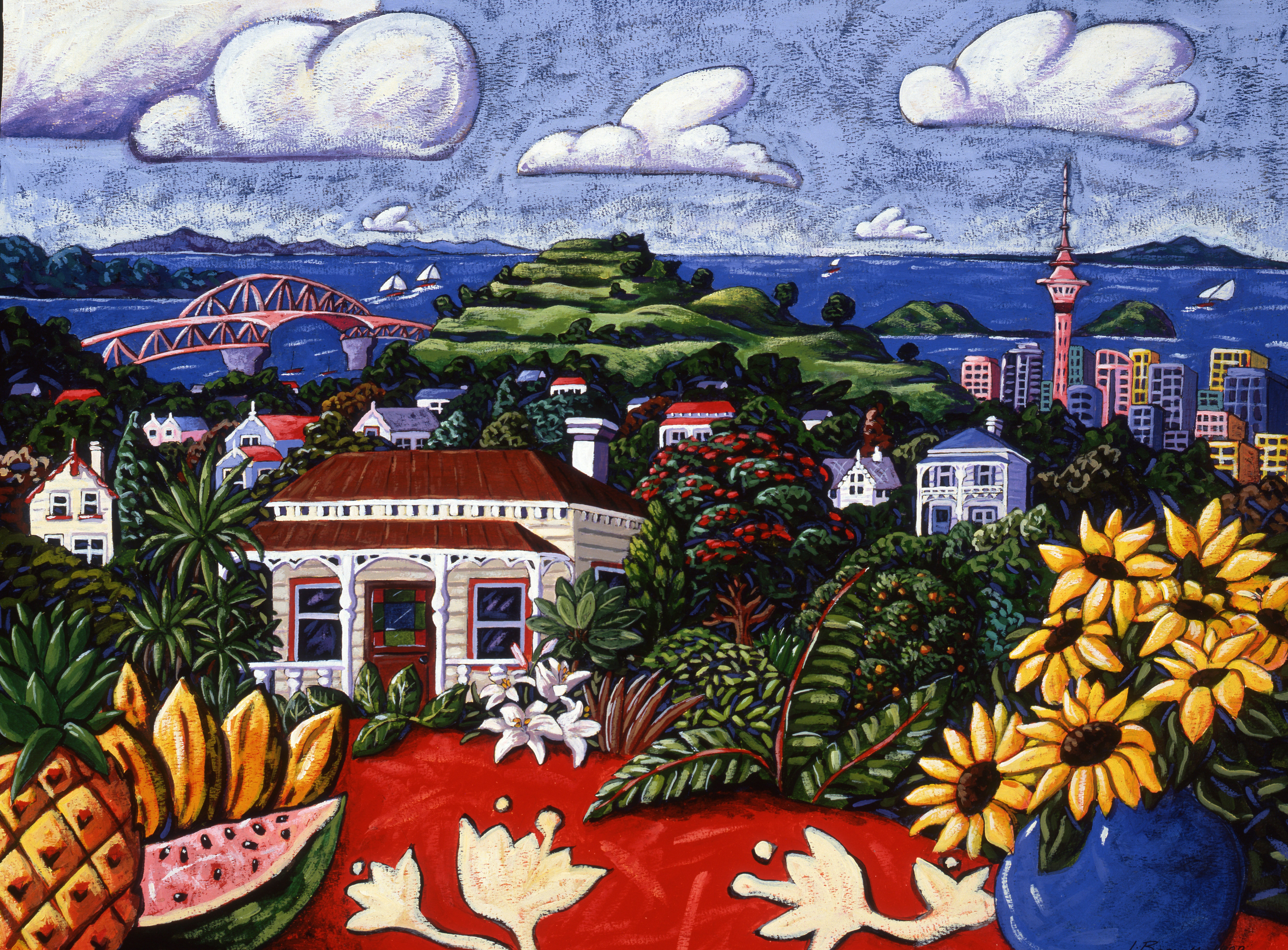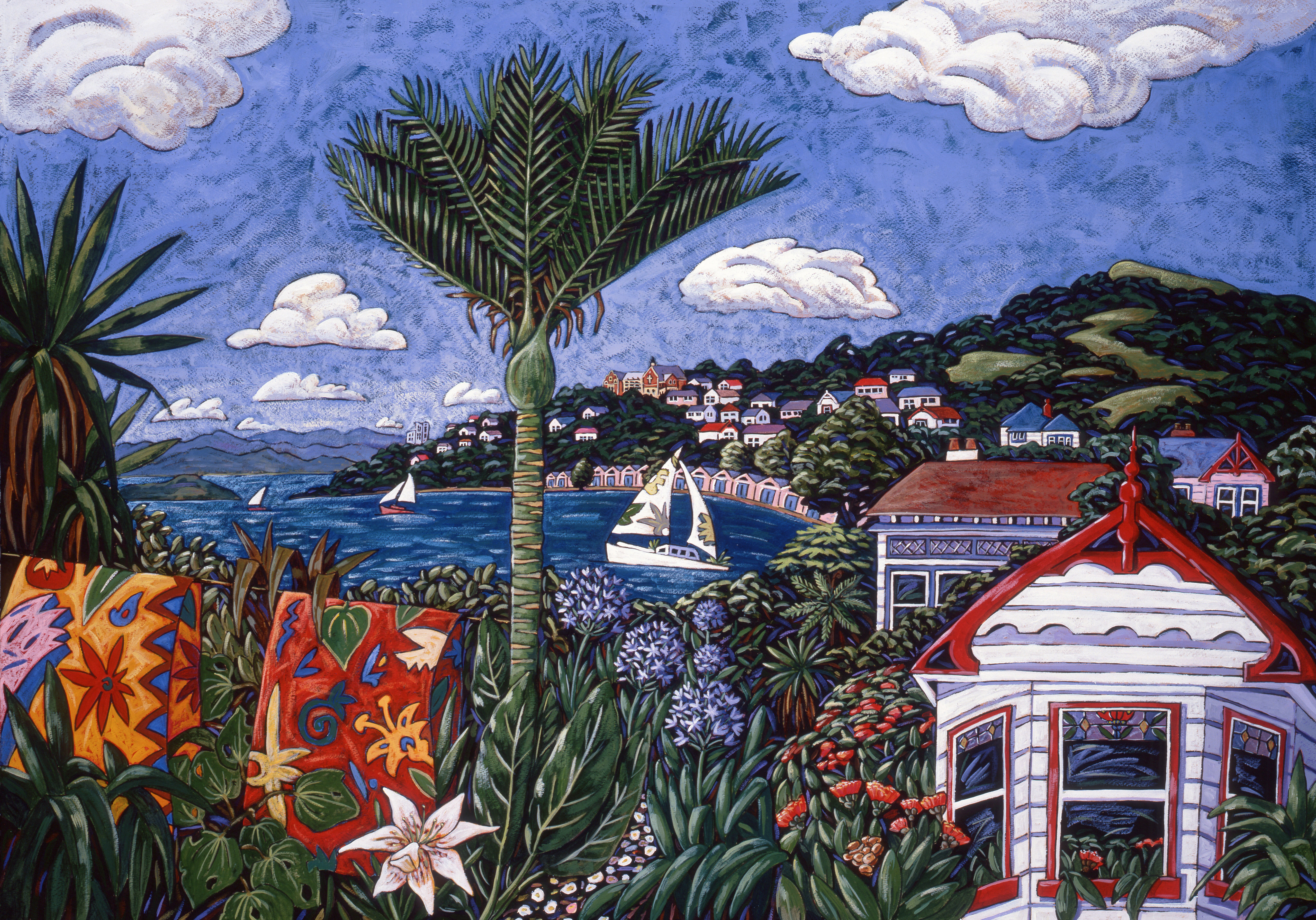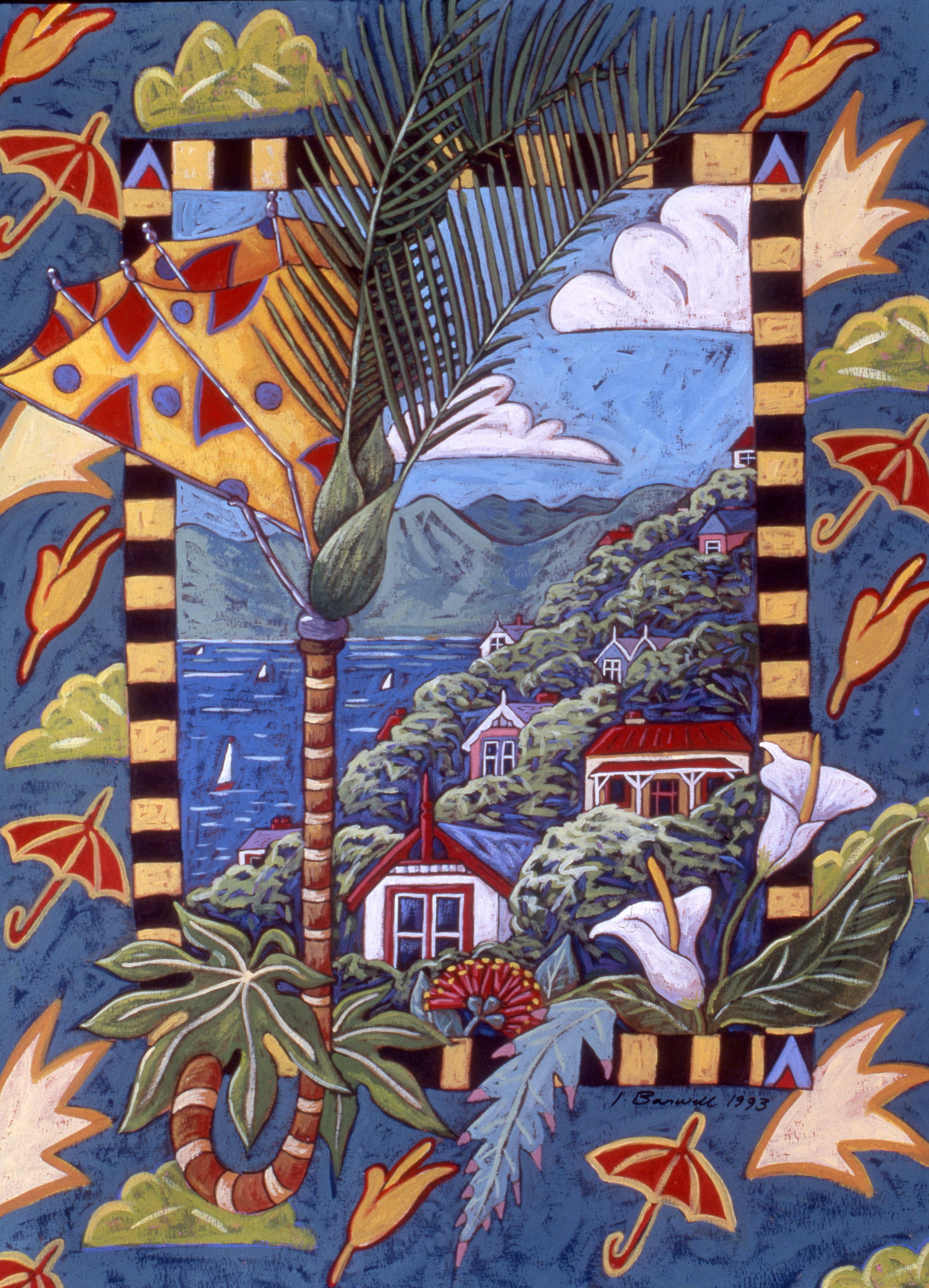 I’m delighted you like the image. Are you in possession of the print or the original? Lucky you if it’s the original! The scene isn’t taken from a specific spot, but, like all my images is a composite of perspectives and landmarks. Having said that, the view is something one might see from high spots in more established suburbs like Te Aro, Newtown or Mt Cook.